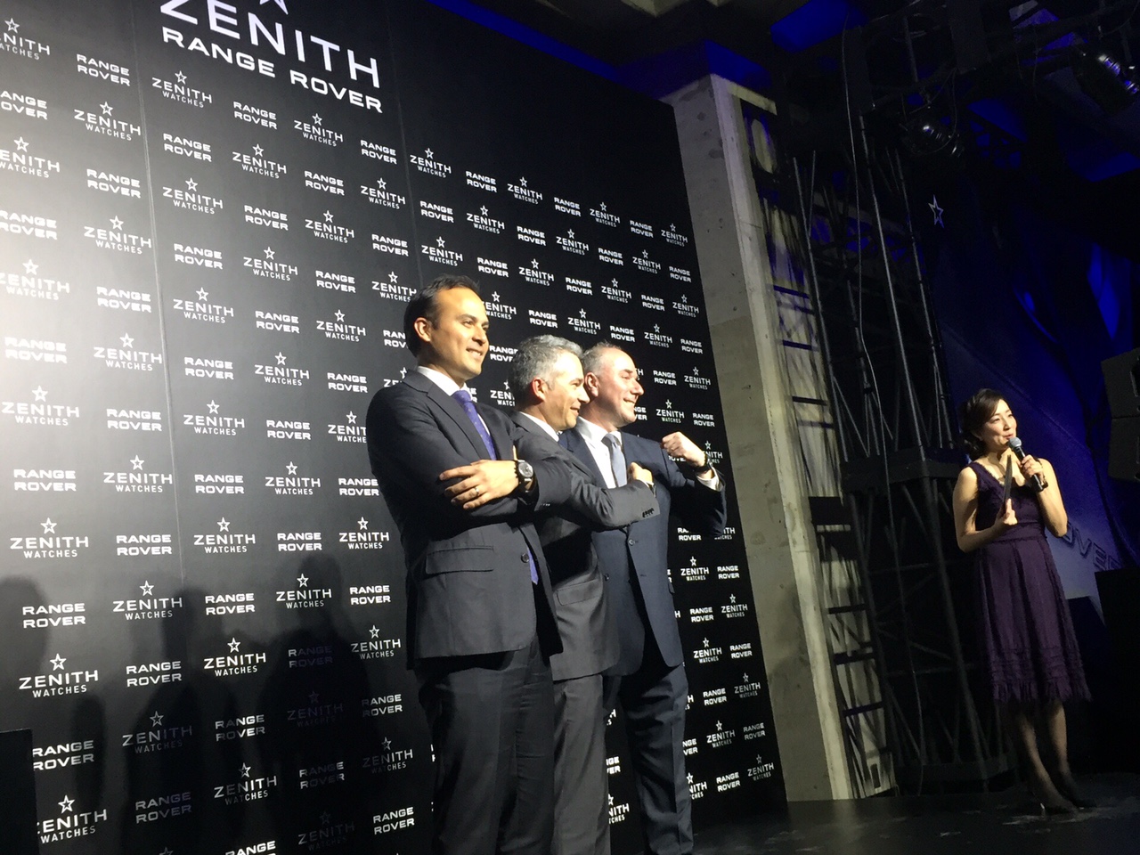 特別仕様の限定クロノグラフ「ゼニス・エル・プリメロ・レンジローバー」を披露するジャガー・ランドローバー・ジャパン 代表取締役社長 マグナス・ハンソン氏(左)、ゼニス インターナショナル コマーシャルディレクター 二コラ・メダ氏(中央)、ジャガー・ランドローバー グローバル・ライセンシング&ブランドグッズ・ディレクター リンゼイ・ウィーバー氏(右)両ブランドのパートナーシップをアピールしました。
