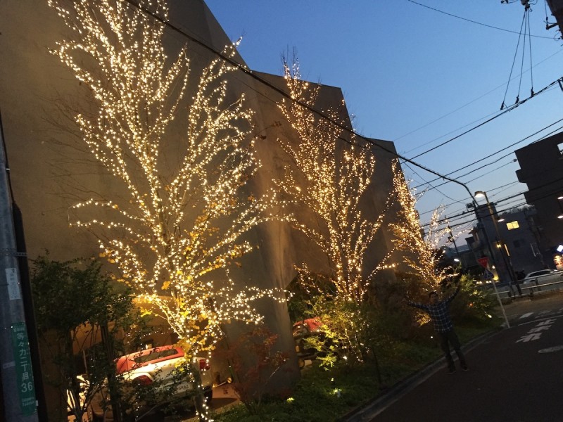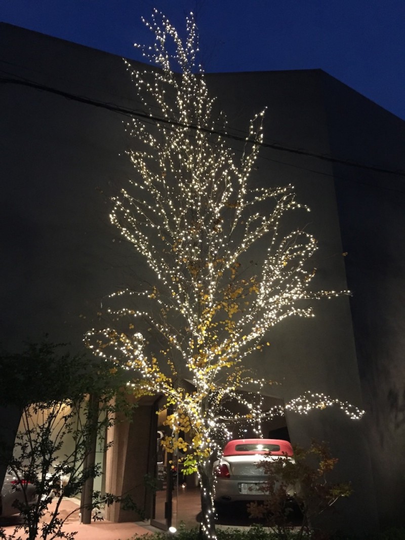 昨年もショールームの脇にある木にイルミネーションを取付けた私、、、