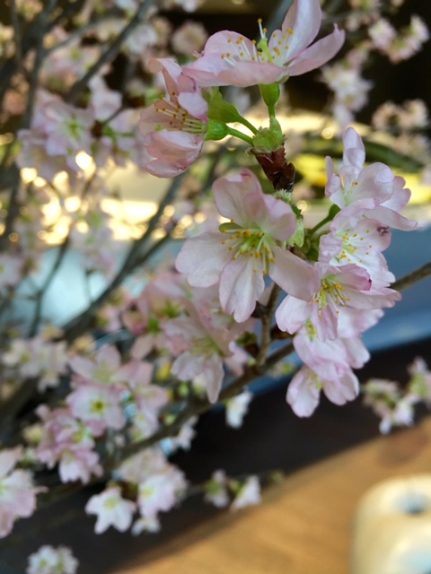 週末に花屋の『花子』さんが飾ってくれたのは、“さ・く・ら”。早咲きの『東海桜』です。かわいいピンクとガクの黄緑色が何ともいえずフレッシュ!