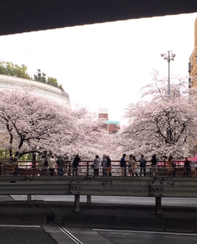 有名な目黒川のサクラ並木の始まりです(左の建物は大橋ジャンクション)。夜は川沿いの提灯に灯りが入って夜桜見物で賑わっていました。