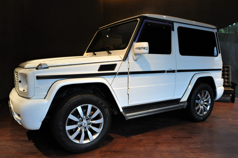 【入荷情報】2001年 Mercedes Benz G320 ショート ロリンザー ポーラーホワイト×ブラック 左ハンドル 18インチA.R.Tホイール プライバシーガラス スライディングルーフ メモリー機能付き本革シート 分割可倒式リアシート シートヒーター クルーズコントロール 社外ナビ TVチューナー ETC レーダー ドラレコ