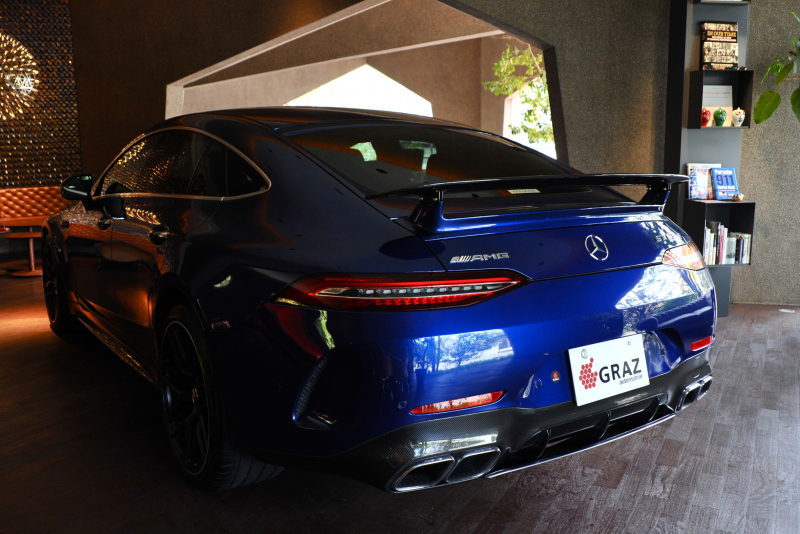 【契約御礼】2019年 MERCEDES-AMG GT 4Door Coupe 63S 4MATIC+ ブリリアントブルー × トリュフブラウン&ブラック ディーラー車 左ハンドル AMGパフォーマンスパッケージ(AMGパフォーマンスシート・マットブラックペイント21インチAMGクロススポークアルミホイール) Burmesterハイエンド3Dオーディオパッケージ(Burmesterハイエンド3Dサラウンドシステム・ガラススライディングルーフ) AMGカーボンパッケージ(AMGカーボンファイバーインテリアトリム・AMGパフォーマンスステアリング・AMGカーボンファイバーエンジンカバー・AMGエクステリアカーボンパッケージ(フロントスポイラーリップ・ドアミラーカバー・フロントフェンダーアクセント・サイドスカート・リアディフューザー・アジャスタブルリアウィングスポイラー)) レーダーセーフティパッケージ マルチビームLEDヘッドライト 360°カメラシステム パークトロニック クラッシュセンサー連動機能 メモリー付パワーシート 前席(シートヒータープラス・アームレストヒーター・ベンチレーター) 後席シートヒーター マルチファンクションステアリング 12.3インチコックピットディスプレイ 自動防眩ミラー キーレスゴー AMGダイナミックエンジンマウント AMGRIDECONTROL+エアサスペンション AMG強化ブレーキシステム イエローキャリパー AMGパフォーマンスエグゾーストシステム ヘッドアップディスプレイ エアバランスパッケージ