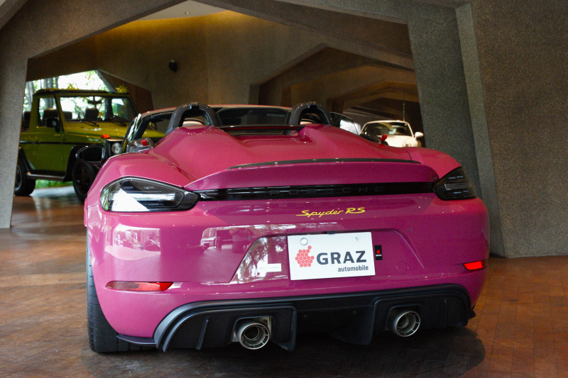 【契約御礼】2024年 PORSCHE 718 Spyder RS PDK ルビースターネオ × ブラック/アークティックグレー × ブラックソフトトップ(カーマインレッドアクセント付) 左ハンドル ディーラー車 ワンオーナー 20インチサテンブラック塗装718 Cayman GT4 RS鍛造アルミホイール リムボーダーレーシングイエロー付 PCCB ヴァイザッハパッケージ アクセントロゴパッケージ(イエロー) ウィンドウトライアングルカーボントリム フロントリッドカーボン仕上げ PDLS付LEDメインヘッドライト フロントアクスルリフトシステム クロノパッケージ 18Wayアダプティブスポーツシート シートヒーター ドアトリムパッケージ(レザー/Race-Tex) シートベルト (アークティック グレー) ブラックレザーステアリング&ギアレバー レザーステアリングコラムカバー イルミネーション付カーボンドアシルガード Race-Texサンバイザー カーボンフロアマット(レザーエッジ付き)、カラーステッチ付き | レーシングイエロー ライトデザインパッケージ 助手席フットウェル収納ネット BOSEサラウンドサウンドシステム Apple CarPlay ETC
