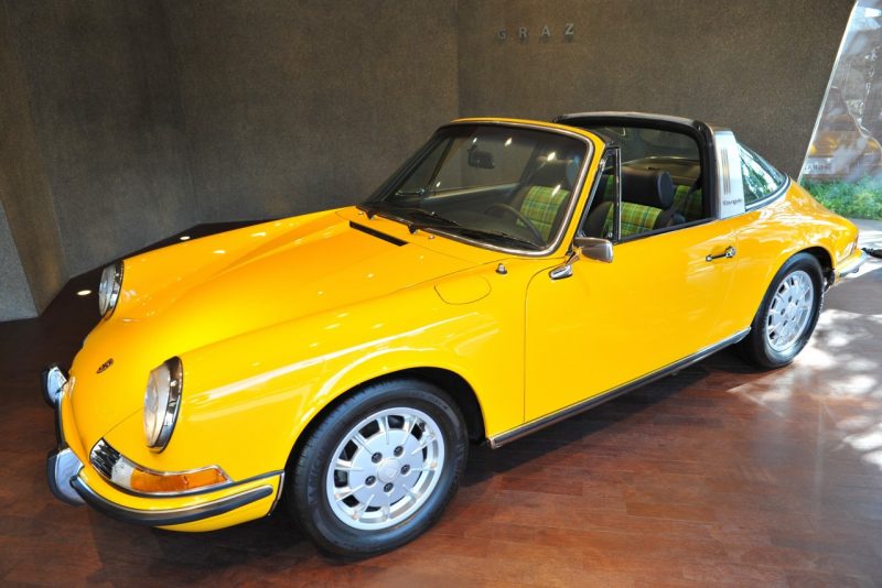 【入荷情報】1972年 Porsche 911 (Type911) 911Tタルガ 5速MT スピードイエロー×ブラック&グリーンチェックレザーシート エアコン エンジンOH済み タルガトップシール交換済み 各部モール交換済み ベンチレーションウィンドウ ビルシュタイン製ショックアブソーバー ETC車載器 禁煙車 15インチ純正アルミホイール!