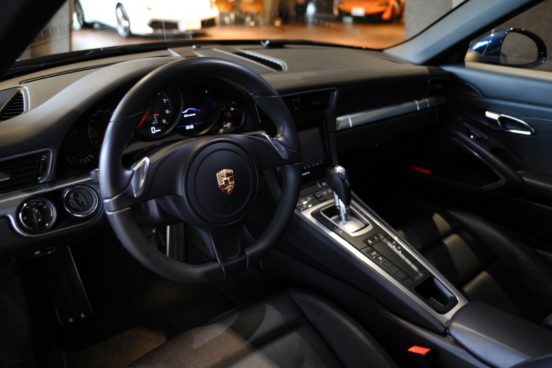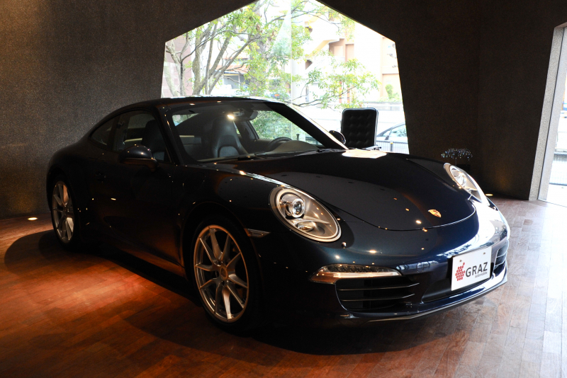 ■ダークブルーのエクステリアにブラックのインテリアでシックに仕上がった911(Type991.1) Carreraの入庫になります。20インチカレラSホイールが足元を引き締めレーシーなポルシェの世界観に絢爛さを息づかせています。