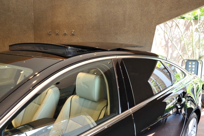 ■ボディーカラーは、風格のある「アルティメットブラック」。アイボリーのシートカラーのコンビネーションは、伝統的かつクールな印象で、シチュエーションを選ばずお乗りいただけます。また、ゆったり広々としたキャビンをプライベートな空間に保つ熱線反射ガラスのパノラミックサンルーフは、車幅いっぱいにリアシートまで広がり、インテリアを軽やかな自然の光で満たし、驚くほどの広さを感じさせてくれます。ガラスはUVをカットすることはもちろん、色付きのためプライバシー